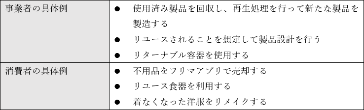 リユースの取り組みでは、例として以下の内容が挙げられます。