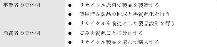 Rの取り組みは、社会全体で進められています。3Rの具体的な例を事業者と消費者に分けて紹介します。