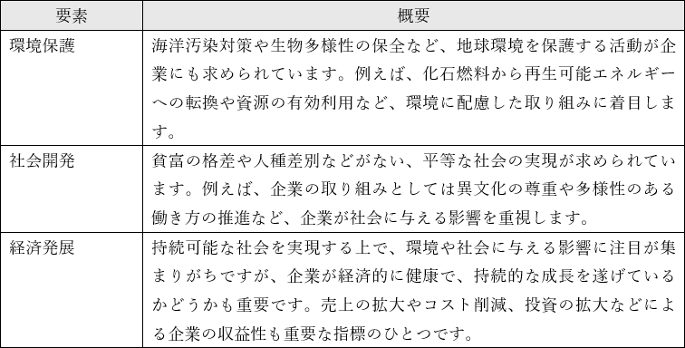 サステナビリティを考える上で重要な視点として、「環境保護」「社会開発」「経済発展」の3つの柱があります。