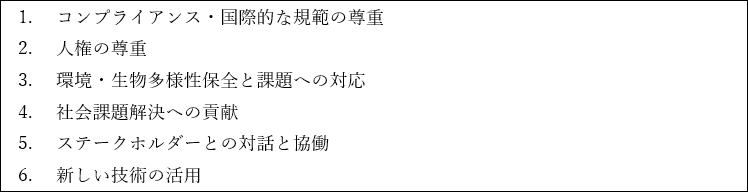 また、環境・生物多様性保全と課題への対応では、「生物多様性の保全に努め、自然資源枯渇防止と、自然の回復力のなかで自然資本が有効に活用される、人と自然環境が調和した自然共生社会の実現を目指す」など、計6つの方針が定められています。