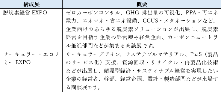 ※「脱炭素経営EXPO」「サーキュラー・エコノミー EXPO」は、「サステナブル経営WEEK(旧称:GX経営WEEK)」の構成展です。