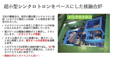 20MeV卓上型電子蓄積リングに重水素及びトリチュームガス10^-4Torr不入するだけで核融合が起こります。電子蓄積リングの周りに配置した水のタンクで発生した中性子を捕獲して、熱に変換し、発生した蒸気を発電機に送ります。ヘッドの大きさは10x5m^2です。
